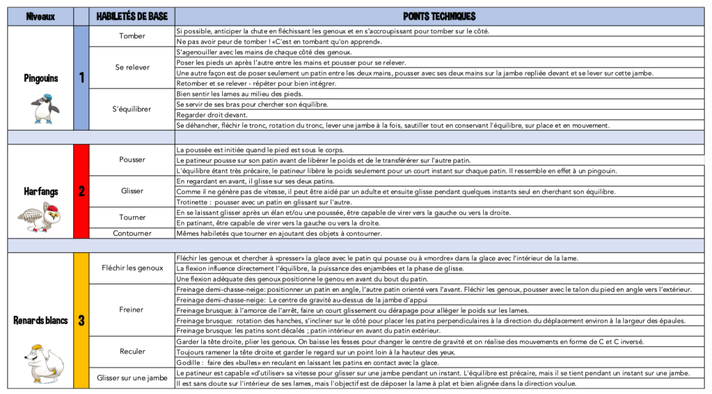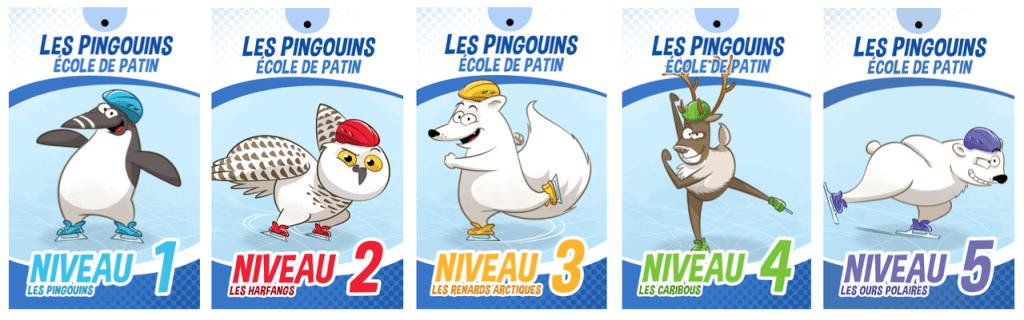 En début de saison, les entraîneurs évaluent les enfants afin de les placer dans le niveau qui correspond à leurs habiletés. L’école de patin décerne des cartes à mesure que le patineur acquiert une nouvelle série d’habiletés sur la glace.